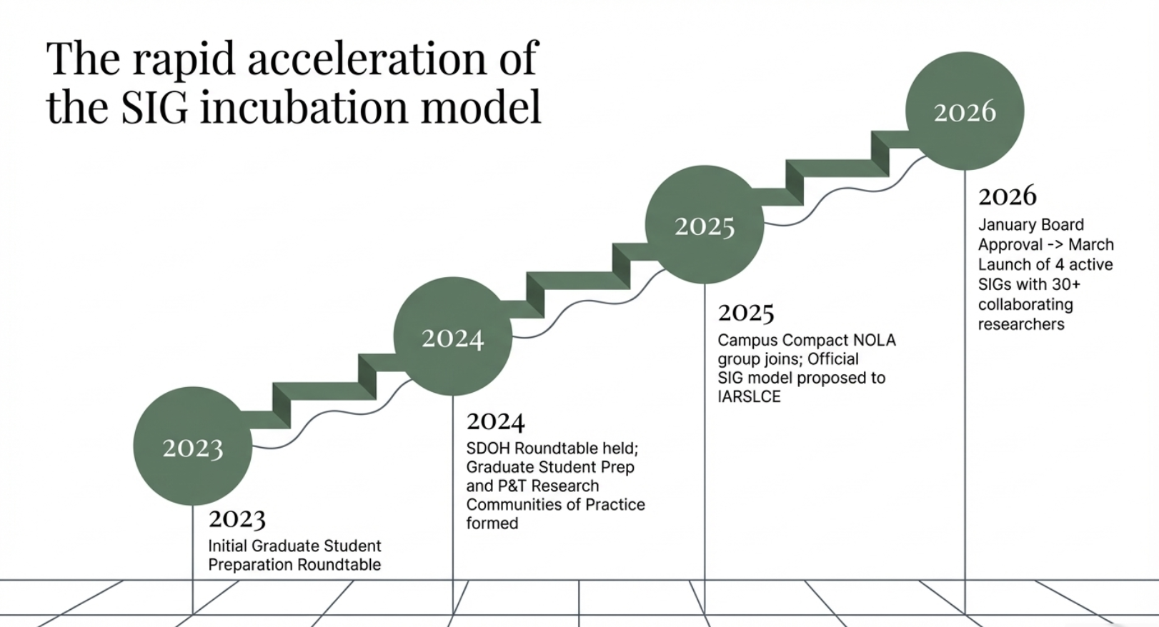 IARSLCE graduate students and early career researchers can affiliate with a SIG for professional development/mentoring/research coaching in a supportive environment e.g. an interested graduate student could co-facilitate/coordinate the incubation and development of SIGs with guidance from the Scholar in Residence